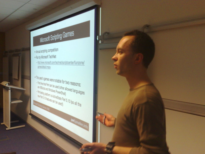 This time around Simon join us on the tour, presenting his iPhone/MMS talk, together with Barbie presenting a Testing with Perl talk and JJ explaining a couple of solutions from the Microsoft Scripting Games.